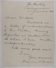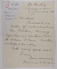 | Description: | Letter from Francis Dixon at the Rectory in Carnarvon, with a letter of introduction to Ken Parker (mining registrar at Souther Cross). |