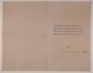 | Description: | A Christmas card from Edmund Clifton to Aubrey Hall, with an enclosed small booklet about the Suez Canal, published by Tuck's Better Little Books. |