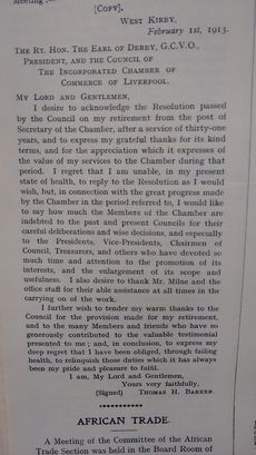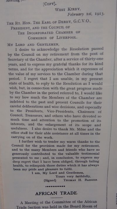 Letter from T H Barker after retirement, Liverpool Chamber of Commerce Magazine, 1913