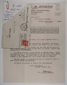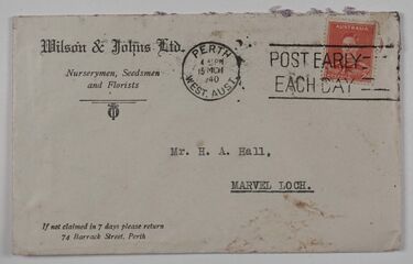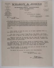 | Description: | Letter from Wilson & Johns nurserymen to Aubrey Hall regarding growing vines fig trees and citrus, and the lack of availability of Buffel or Birwood grasses in the south of the state. |